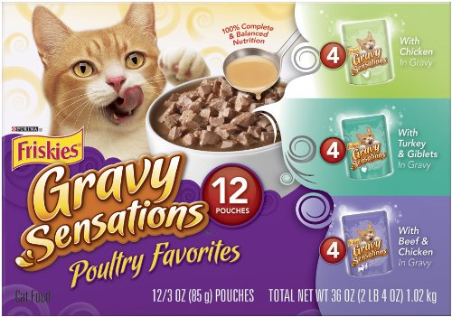 | Friskies cat food, 3-ounce pouches (pack of 24) satisfy your cat's craving for sensory adventure! Exciting flavors – including real poultry, beef, or seafood flavors – enticing aromas and irresistible textures can feed all your cat's senses. Available as canned cat food or in convenient pouches. ...Read