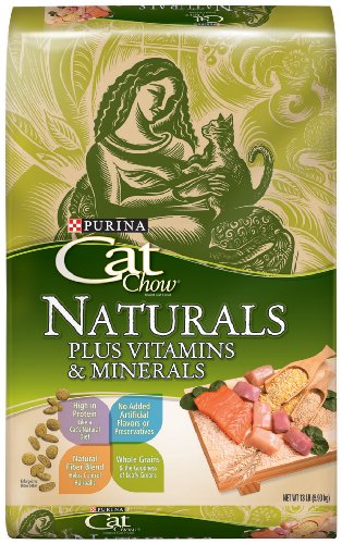 | Purina Cat Chow Naturals Dry Cat Food Purina Cat Chow Naturals Dry Cat Food has natural fiber which helps control hairballs. It is highly nutritious, as it contains leafy greens, real chicken and salmon . There is no artificial colors or preservatives. Features · High in protein, like a cat's natural diet, including real chicken and salmon · Contains whole grains and the goodness of leafy greens · Natural fiber blend helps control hairballs · No added artificial colors, flavors or preservatives Item Specifications: Size 6lb & 14lb Ingredients Chicken meal, corn gluten meal, soybean meal, brewers rice, animal fat preserved with mixed-tocopherols (form of Vitamin E), corn meal, chicken, salmon, powdered cellulose, ground whole wheat, soybean hulls, malt extract, brewers dried yeast, phosphoric acid, natural flavor, tetra sodium pyrophosphate, calcium carbonate, salt, choline chloride, dried spinach, parsley flakes, potassium chloride, taurine, Vitamin E supplement, zinc sulfate, ferrous sulfate, niacin, manganese sulfate, Vitamin A supplement, calcium pantothenate, thiamine mononitrate, copper sulfate, riboflavin supplement, Vitamin B-12 supplement, pyridoxine hydrochloride, folic acid, Vitamin D-3 supplement, calcium iodate, biotin, menadione sodium bisulfite complex (source of Vitamin K activity), sodium selenite. Guaranteed Analysis * Crude Protein (Min) 38.0% * Crude Fat (Min) 13.0% * Crude Fiber (Max) 6.0% * Moisture (Max) 12.0% * Calcium (Ca) (Min) 1.2% * Phosphorus (P) (Min) 1.1% * Vitamin A (Min) 10,000 IU/kg * Vitamin E (Min) 30 IU/kg Feeding Guide Weight Amount Daily* 5 to 9 lbs. ½ to ¾ cup 10 to 14 lbs. ¾ to 1¼ cup *Using standard 8 oz. measuring cup.w ...Read